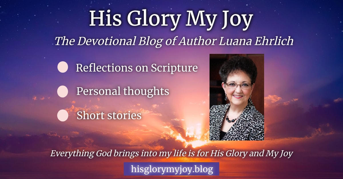In my devotional blog, His Glory My Joy, I share my thoughts on a variety of personal issues (from the ridiculous to the sublime) in the context of how they relate to God’s Word. I usually write a fresh devotional blog once a month. However, since I’ve been writing on this blog for over ten years now, you can search the archive for any topic that might interest you. The title of the blog reflects my spiritual touchstone: “Everything God brings into my life is for His Glory and My Joy,” and is based on the truth of a several Scriptures, some of which are Psalm 16:11; Isaiah 42:8; Isaiah 48:11; Isaiah 43:7.