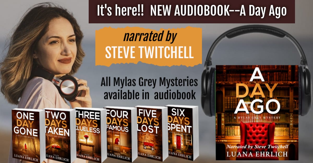 Yes, the wait is over for the audiobook of A Day Ago, the prequel to the Mylas Grey Mystery Series. My narrator for the series, the award-winning Steve Twitchell, has once again delivered an incredible performance, and I know you're going to love hearing his production of this Mylas story. I have a limited number of promo codes for those willing to listen and review. Just email me: author@luanaehrlich.com.