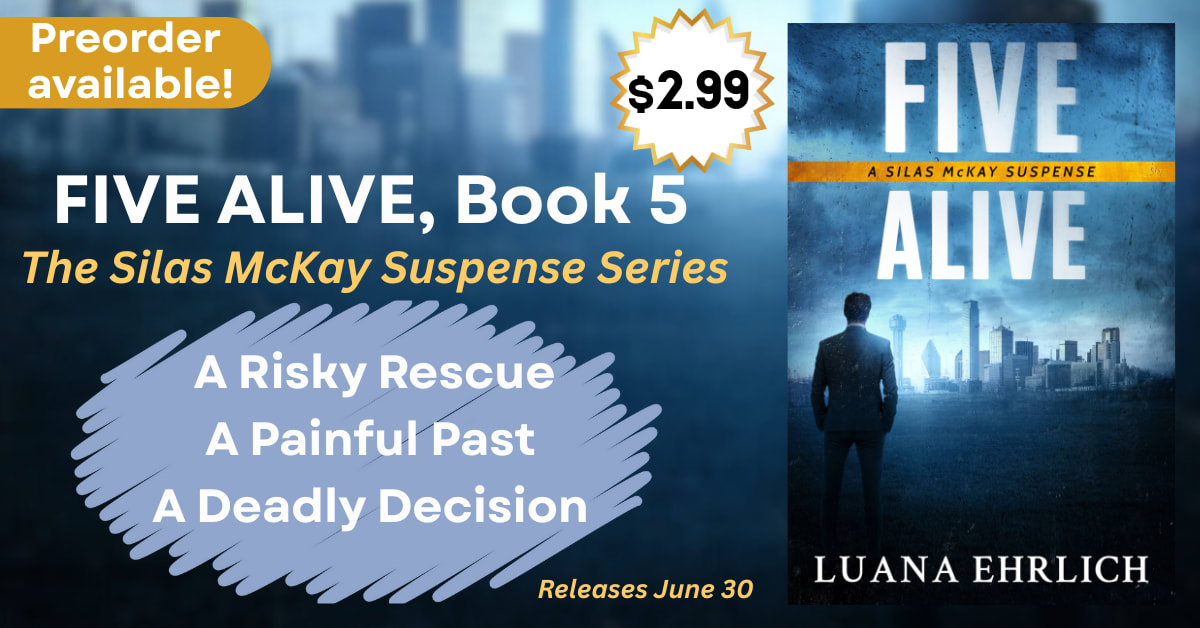 FIVE ALIVE, Book 5 in the Silas McKay Suspense Series, will release on June 30, and you can save $2.00 off the release price if you preorder today. Preorder FIVE ALIVE for $2.99 and be ready to start reading the continuing story of Silas McKay, chief investigator at Discreet Corporate Security Services, and how he's dealing with the world of corporate espionage after meeting Ashley Davenport following the loss of his wife.
